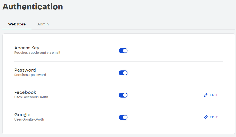 On the Authentication page, you can choose which login methods you want to offer for your store's customers and administrative users accessing the Admin.