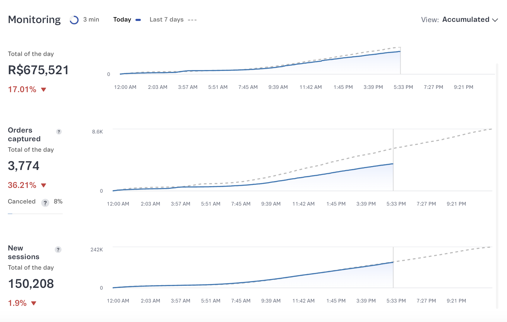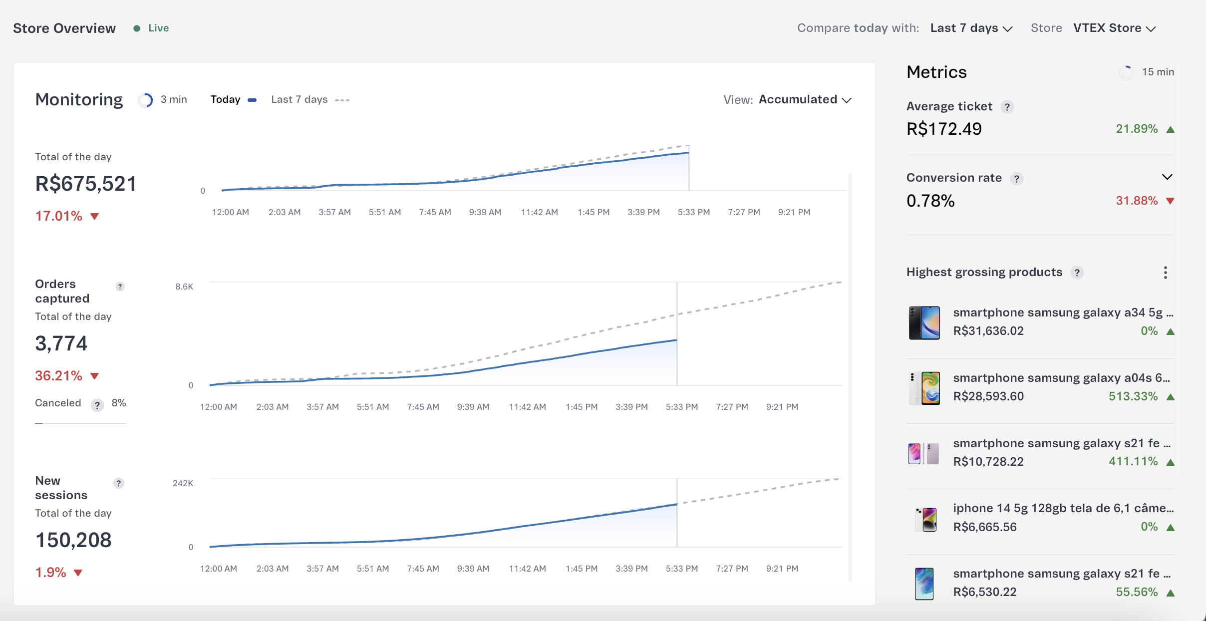 The Store Overview (Beta) page in your VTEX Admin provides real-time tracking of your operation on the current day, giving visibility into indicators that allow you and your team to get feedback about actions applied to the store and to quickly implement improvements.