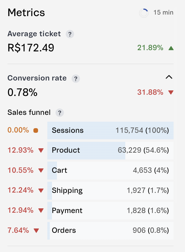 In the Conversion rate metric, when you click the arrow icon , the Sales funnel will be expanded. This chart tracks and monitors session volume in the intermediate stages of the purchase flow and allows you to identify opportunities to optimize the conversion rate of your store. The table below describes the intermediate stages of the purchase flow.