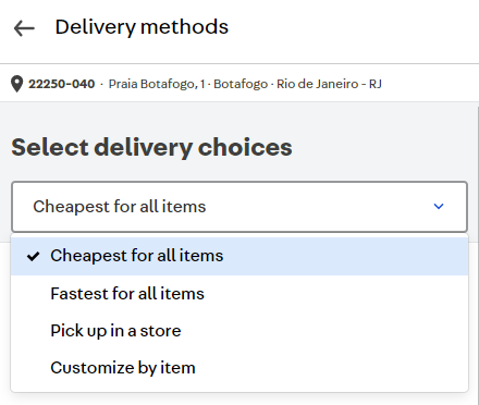 The next screen allows you to define delivery choices. Since VTEX Sales App handles inventory from multiple stores, there are several possibilities for arranging delivery, depending on where the products in the cart are located.