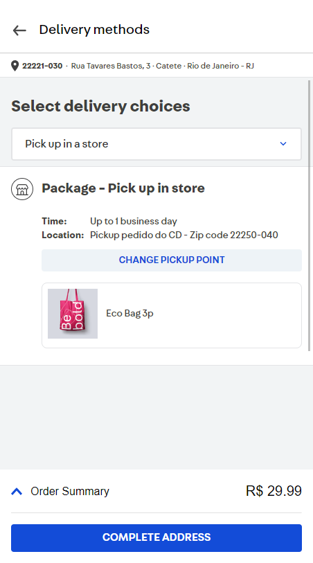 For pickup point options, the system selects the stores that have the SKUs in stock and shows the store closest to the customer's zip code, as a suggestion. If the sales associate wants to change the store where the customer will pick up the items, they just need to click the Change pickup point button.