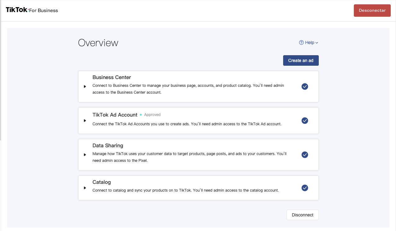 After disconnecting, it is possible to reactivate the integration at any time by repeating the steps described in Configuring the integration with TikTok for Business.
