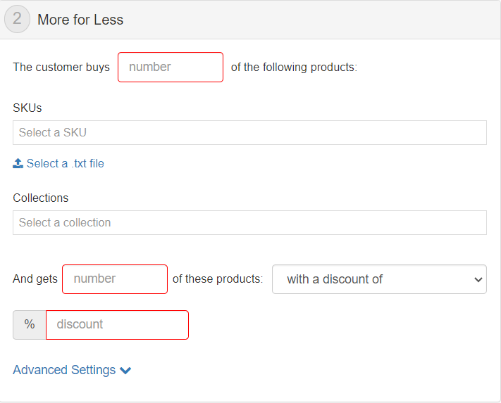 In the configuration of the More for Less promotion, the store must define which collections or SKUs it will apply to. Then, it must choose the minimum number of items in the cart for it to apply and the number of items that get a discount.