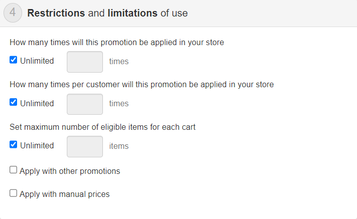 - Items by cart: this setting restrict a promotion to a predetermined number of items in the cart. Once the limit is reached, the promotion will apply to the rest of the cart. The system uses price as a selection criterion so the items with the lowest prices will be affected first.