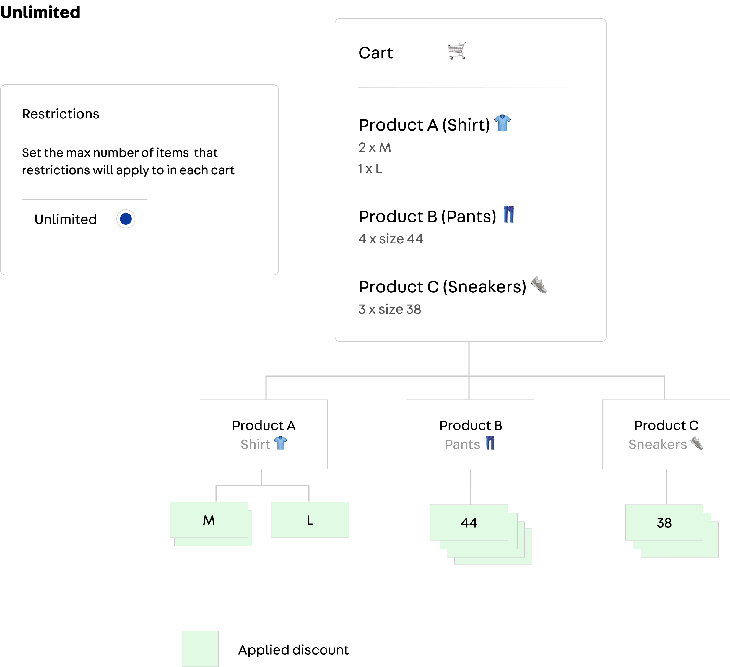 By default, the unlimited selection is active, applying the promotion to all items in the cart, as illustrated in the diagram below: