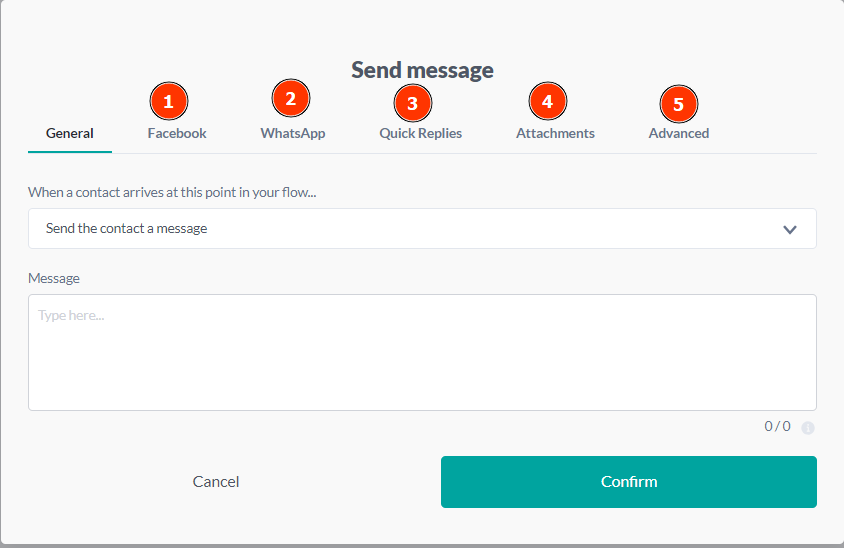 The most popular and widely used action card on the platform. Its function is to send a message to the contact. This message will be received regardless of the channel the user is chatting in, just write it in the text box.