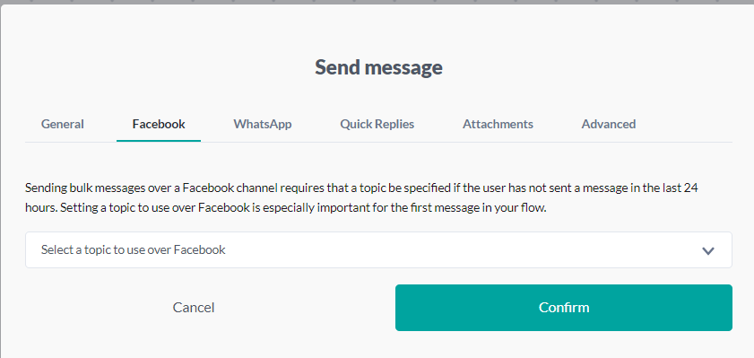 Sending mass messages via a Facebook channel requires specifying a topic if the user has not sent a message in the last 24 hours. Setting a topic to use on Facebook is especially important for the first message in your flow.
