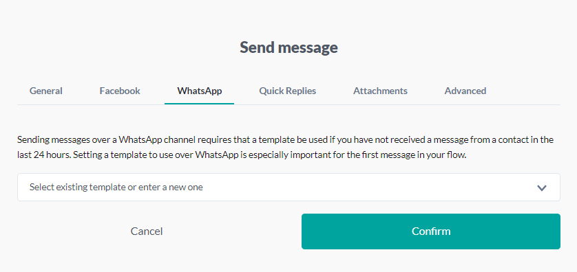 Sending messages via a WhatsApp channel requires using a template if you have not received a message from a contact in the last 24 hours. Configuring a template for use on WhatsApp is especially important for the first message in your flow. Read the article about conversations started by a business on WhatsApp.