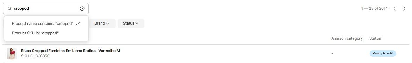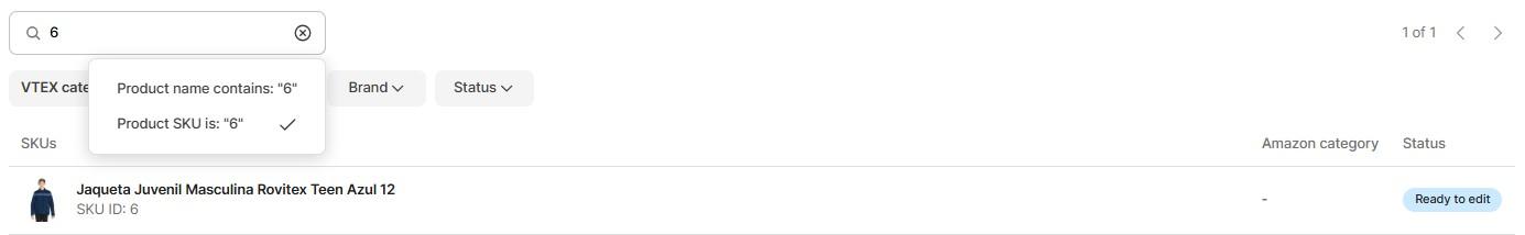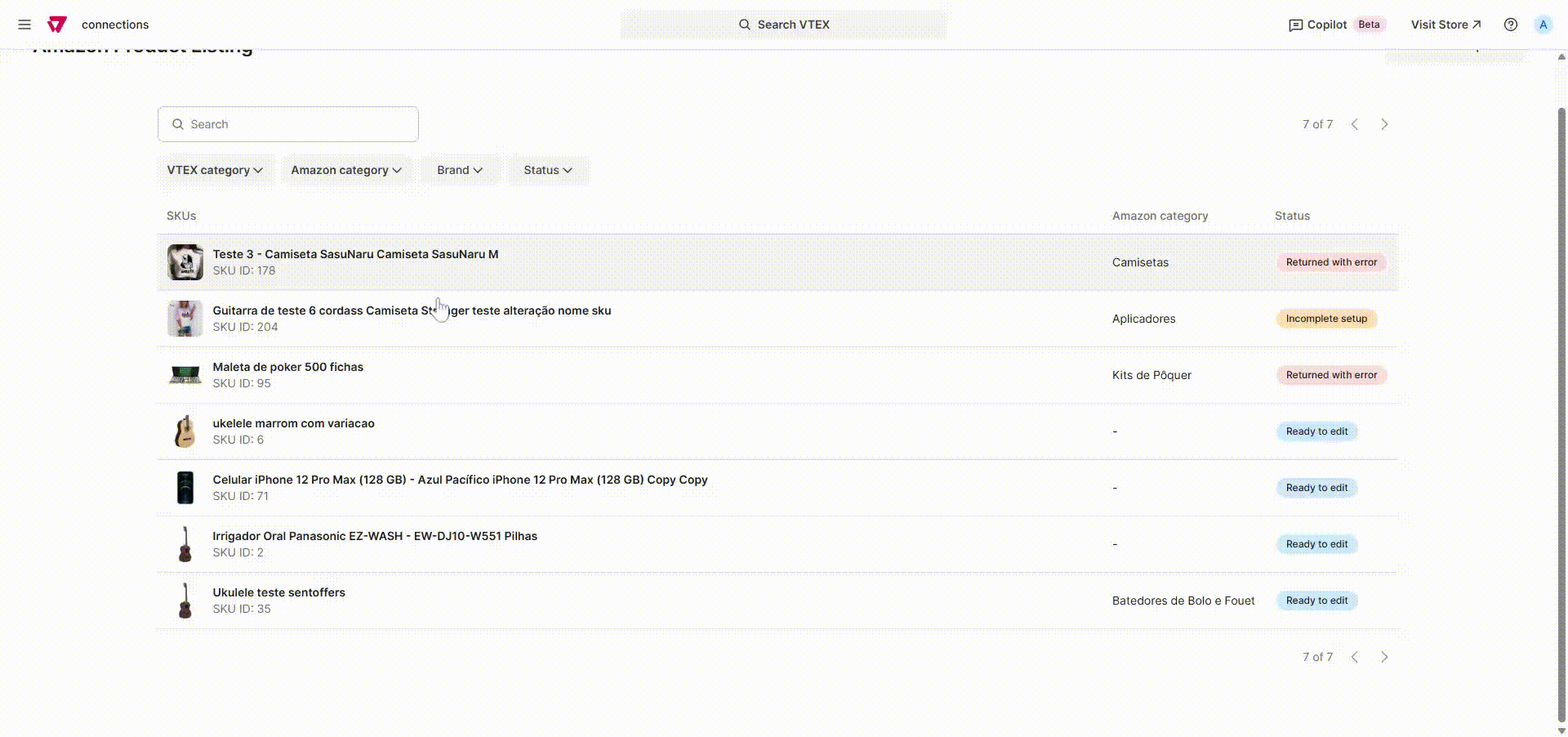 You can filter SKUs by VTEX category, Amazon category, Brand, or Status. Filters can be applied individually or combined, depending on the seller's strategy.