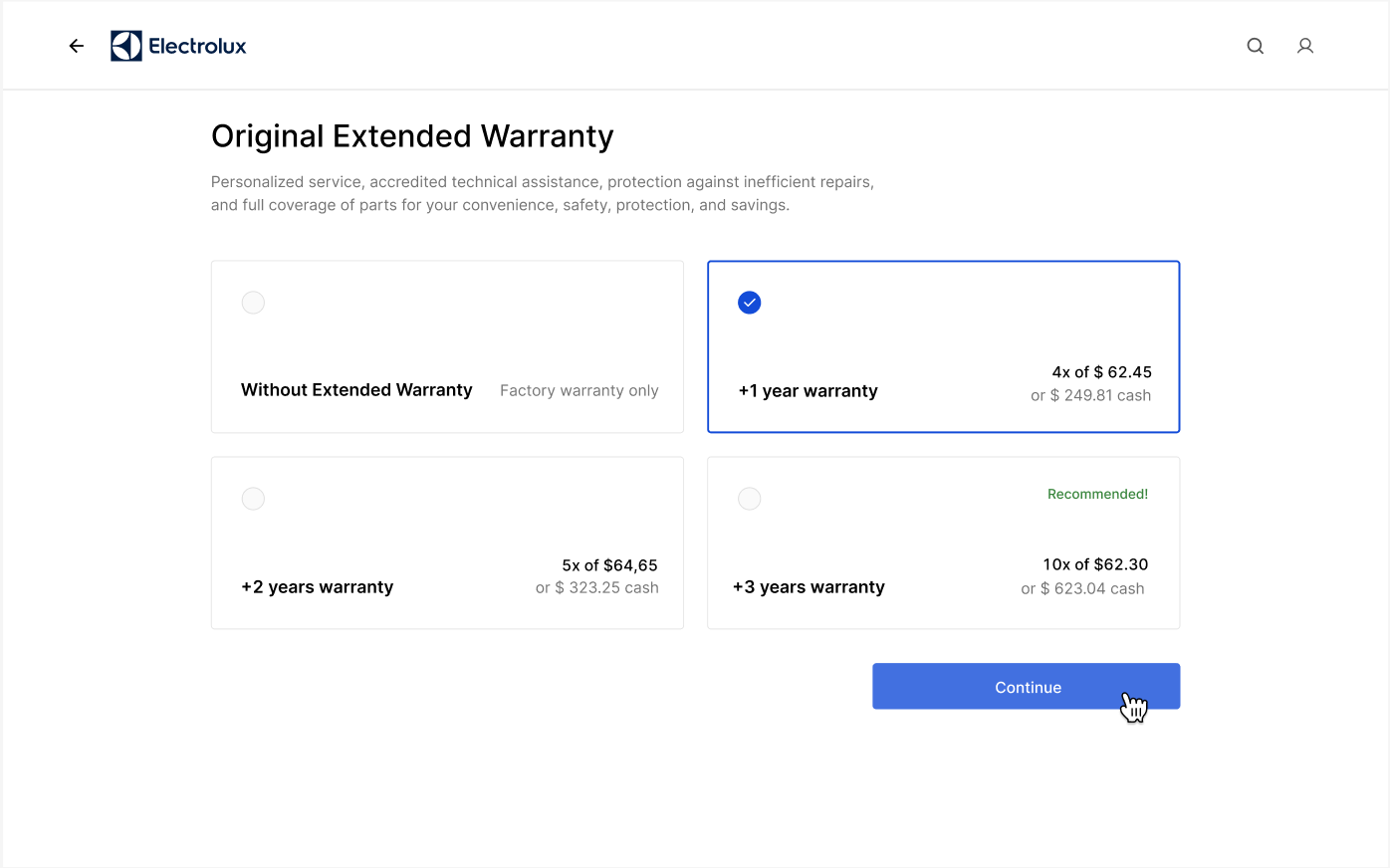 - Select the service option you want and click the Continue to Cart button.