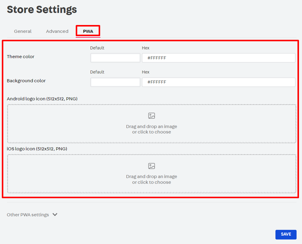 - Set the Theme color, Background color and add the Android logo icon (512x512, PNG) and iOS logo icon (512x512, PNG). The colors must be specified in hexadecimal code (e.g., #F71963), and the icons must have a size of 512x512 px and a