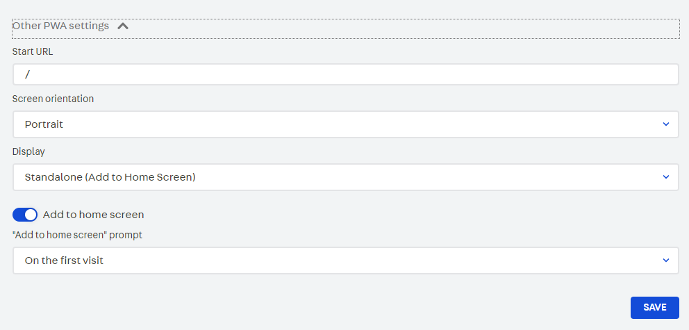 - "Add to home screen" prompt: Defines the moment when the PWA installation will be recommended to the user. One of the following values can be assigned: On the first visit, On the first item added to the cart, or On the first order. This option only applies when Add to Home Screen is activated.