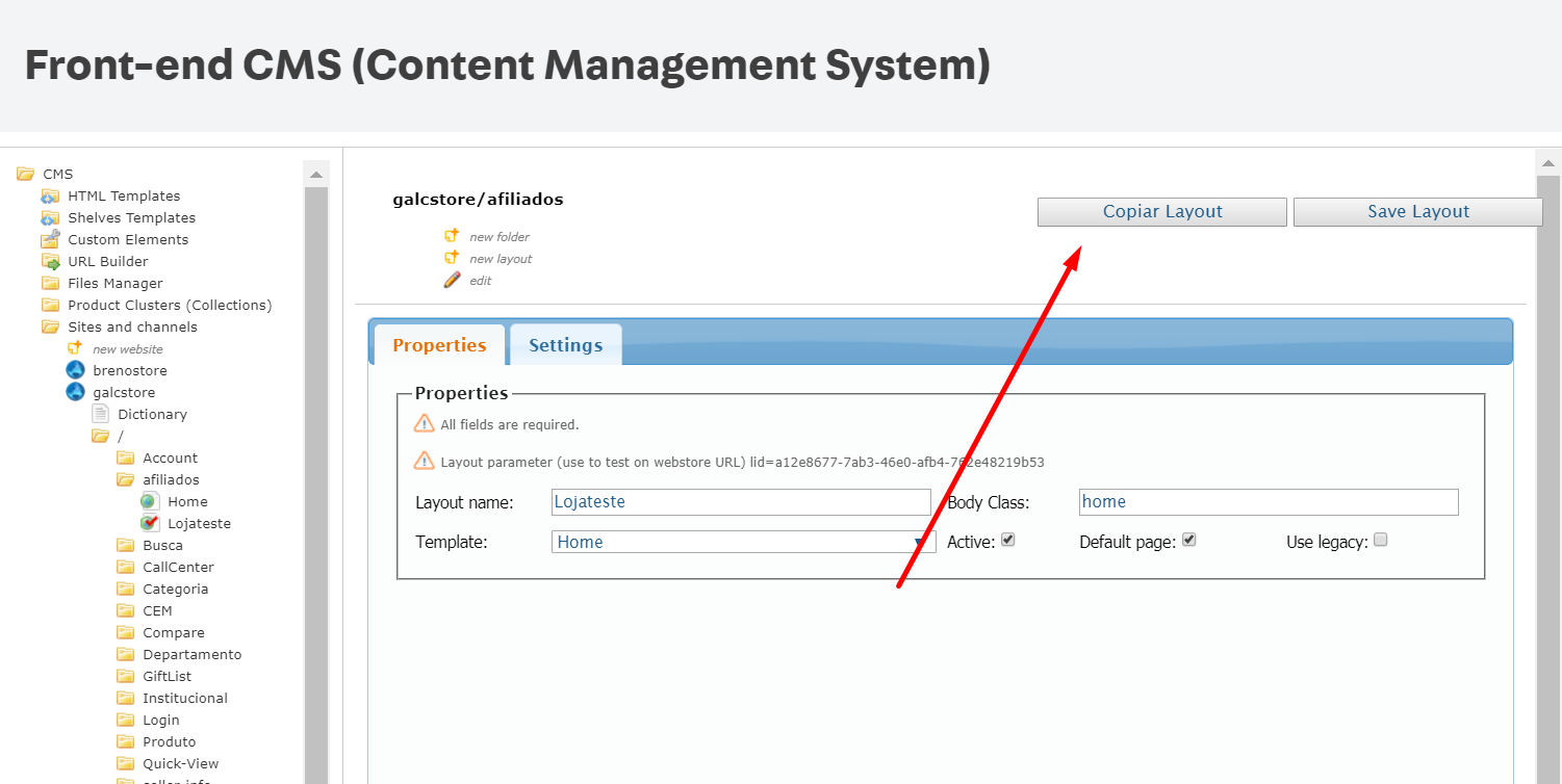 If you have more than one web site in your store and want to copy a layout from one of them to another, you can do so by using the Copy Layout button.
