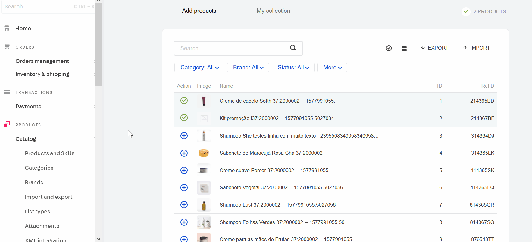 Products can be added either by selecting items from the Collection module list or importing a spreadsheet in CSV or XML format.