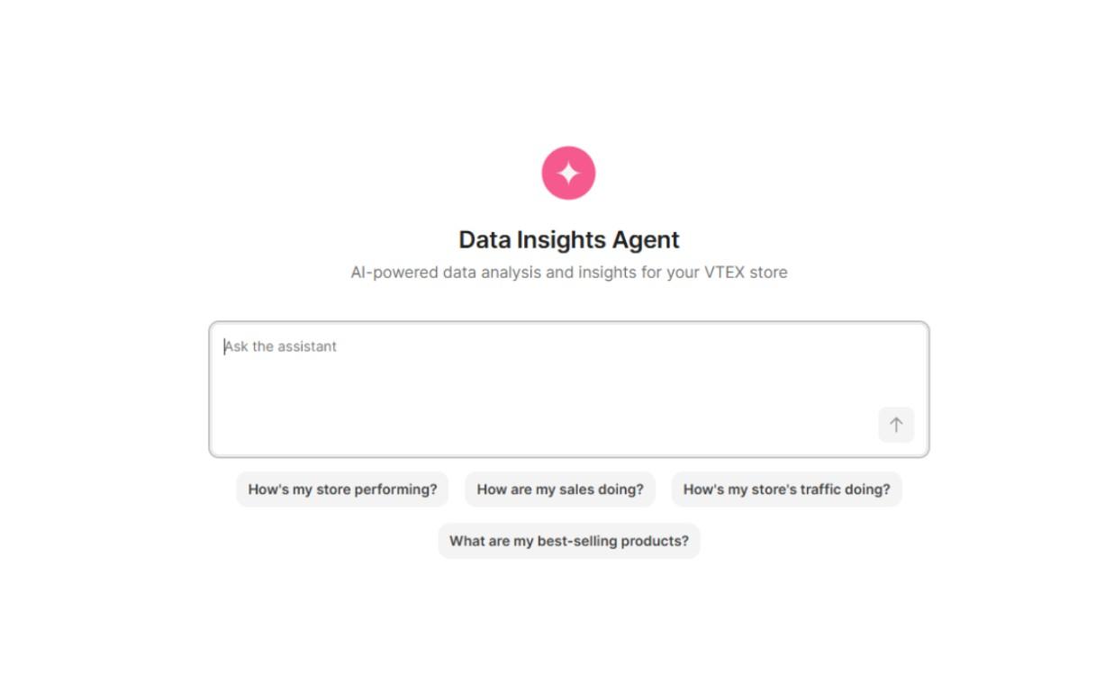To interact with the agent and start analyzing your store data, in the VTEX Admin, go to Dashboards > Data Insights Agent or type Data Insights Agent in the search bar. The page includes a conversation window and suggested questions to help you start an analysis with the assistant.