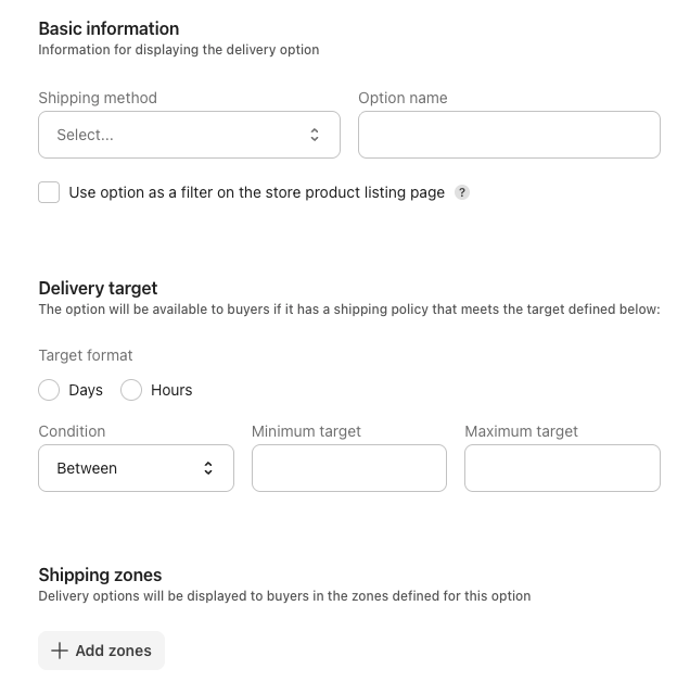 The delivery options use the information already defined in the store shipping policies. If these settings aren't defined or don't meet the delivery target of the shipping options, see the article Creating a shipping policy.