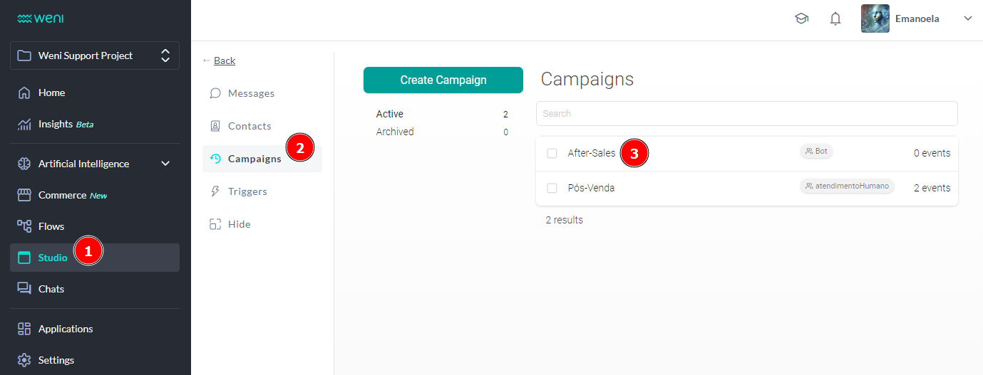 - Click on the ""Campaigns"" menu within the ""Studio"" module in the side menu and select the campaign containing the event you'd like to edit.