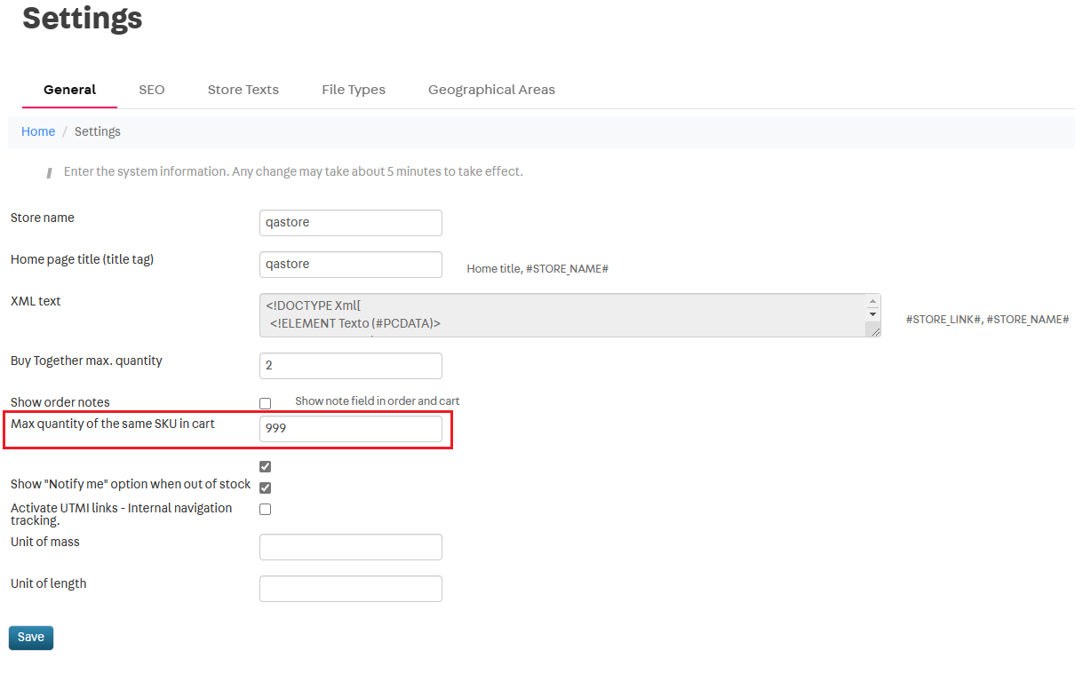 2. On the tab General, fill in the desired value in the field Max quantity of the same SKU in cart.