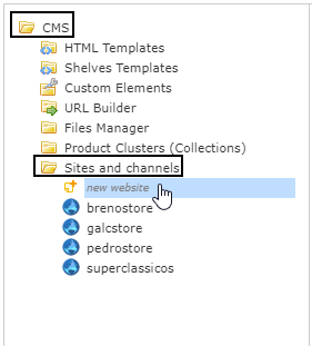 Storefront > Layout > CMS folder > Sites and Channels > New Website
