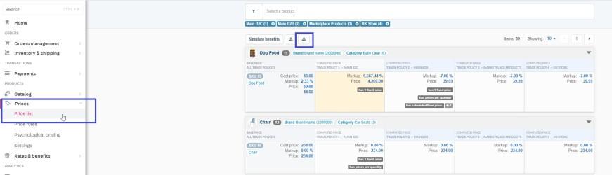 - In the newly opened tab, on the left side, hover over and click on the Export Prices Spreadsheet button