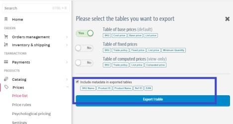To include metadata when exporting a SKU prices spreadsheet, follow the steps below: