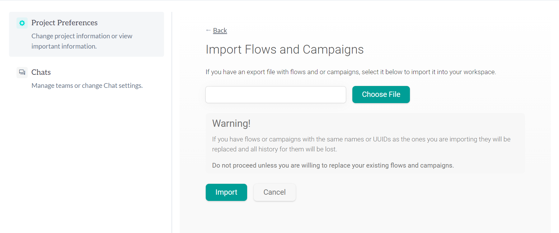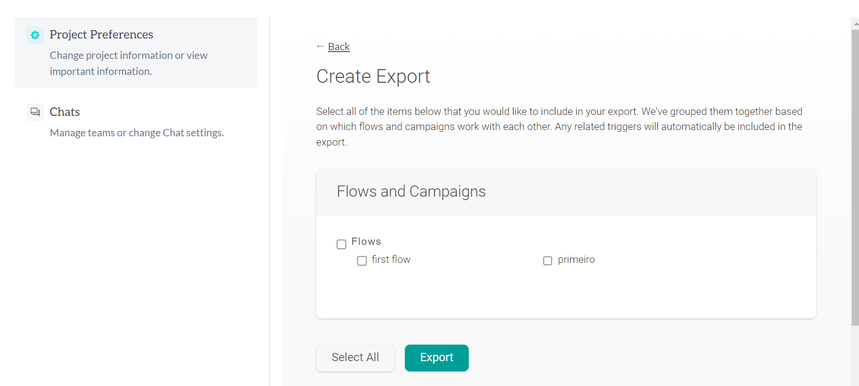 Once on the export page, it will display all the flows and campaigns of that organization, grouped by usage, meaning all flows in the same group interact with each other. If you export only one flow from a group, you may experience issues with its functionality.