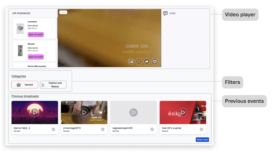 - Live player: Dedicated player for streaming the selected live shopping event, including the list of featured products and chat.