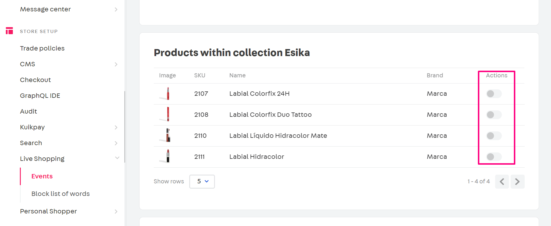 Actioncolumn. - In the Products within collection section, choose the desired products to show during the live stream by activating the