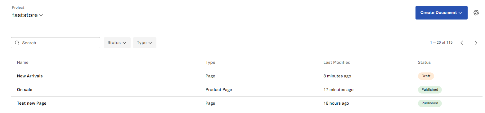 | Type | Filters the pages according to their content type. The content types are defined in your store code. For more information, see Adding Content Types to the Headless CMS. |