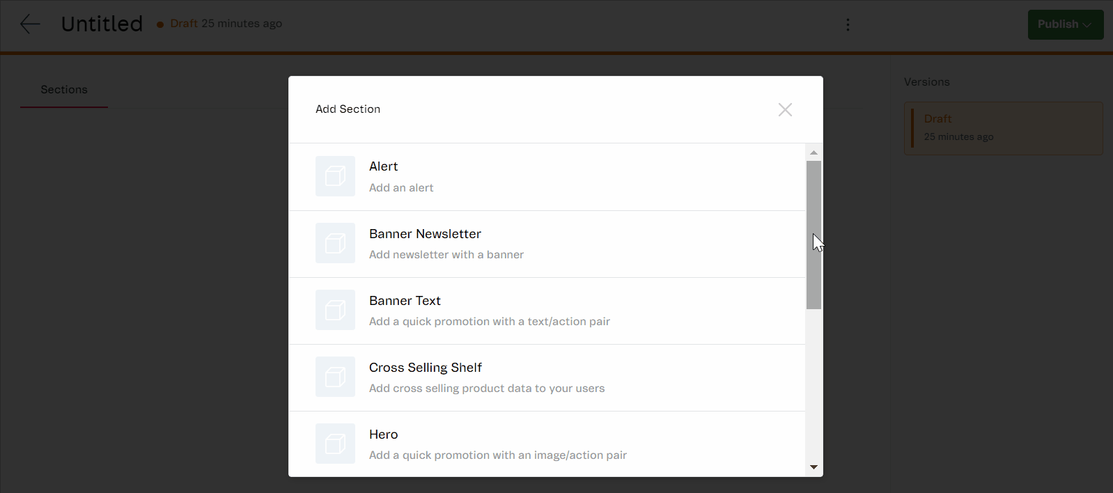 | Create Document | Creates a new page based on the options available, e.g., Product Page or Home. |