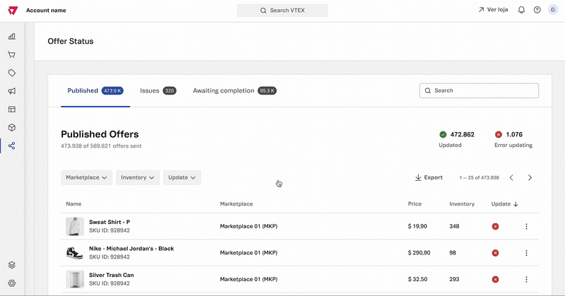 The Offer Status module allows sellers to track the sending and syncing of their offers on all sales channels integrated with the store. On VTEX, an offer is an SKU from a seller sent to a sales channel whose price and inventory information have been configured.