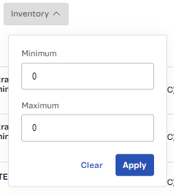 To filter the offers by Inventory, click the down arrow, enter the minimum and/or maximum inventory, and click Apply.