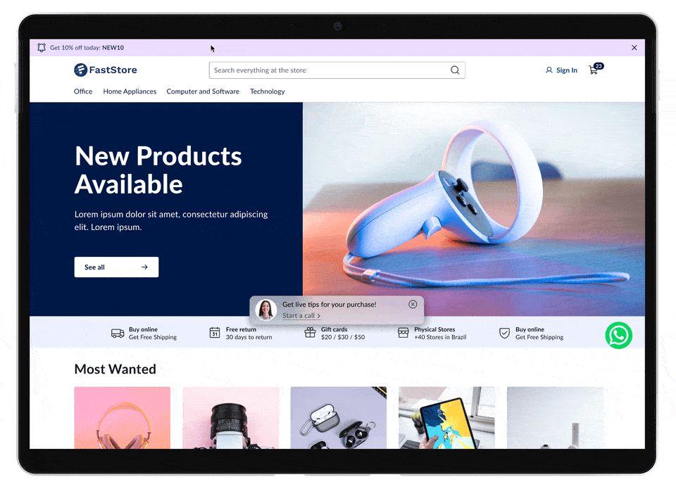 - VIII - Products: Shows a lateral menu that allows participants to view the products related to the current call, search for other store products, and share them with others.