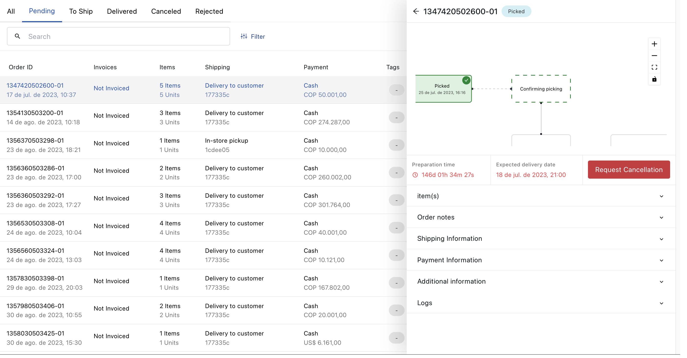 - Items: The list of items in the order. You can search for an item by entering its SKU ID or name in the search bar. You can also click the item to view more details about it.