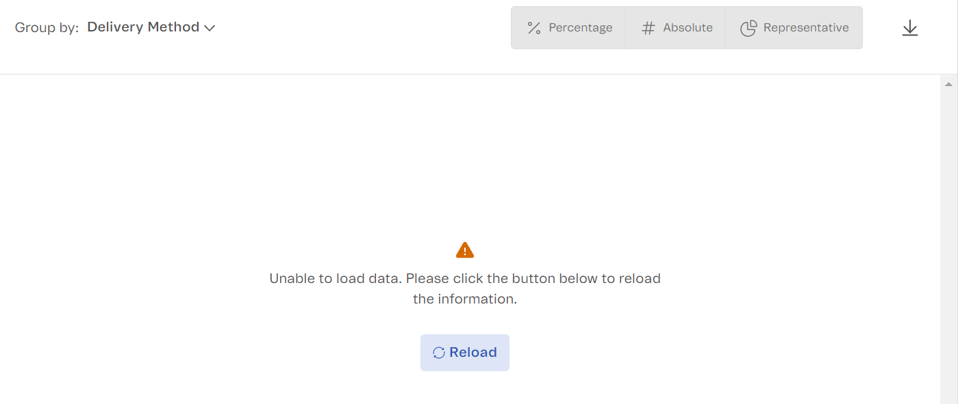 When try to group by the Delivery Method on the Sales Performance Dash, an error shows up: "Unable to load data. Please click the button below to reload the information."