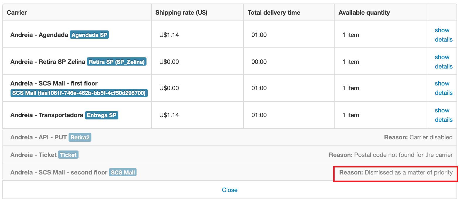 - Avoiding using the same name for the shipping methods of two pickup points that operate in the same region. For example, in the case of the simulation described, the solution would be to rename one of the shipping methods.