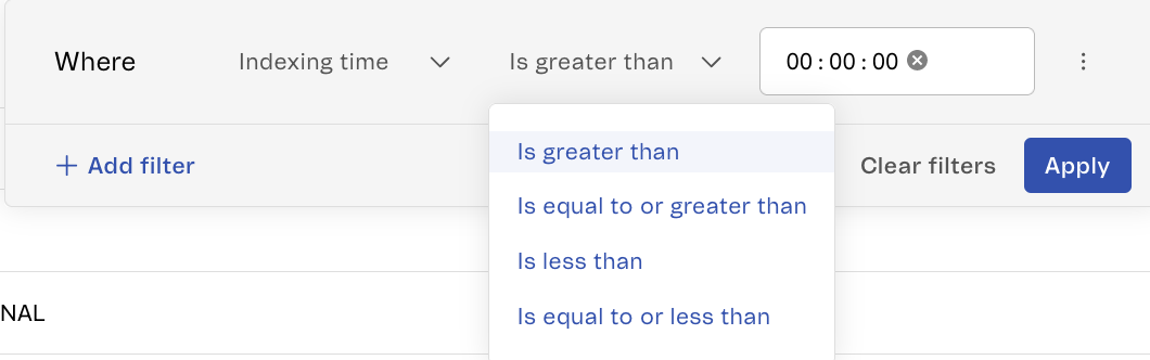 If you filter by Indexing time you can select whether the time interval Is greater than, Is equal to or greater than, Is shorter than or Is equal to or less than a defined time.