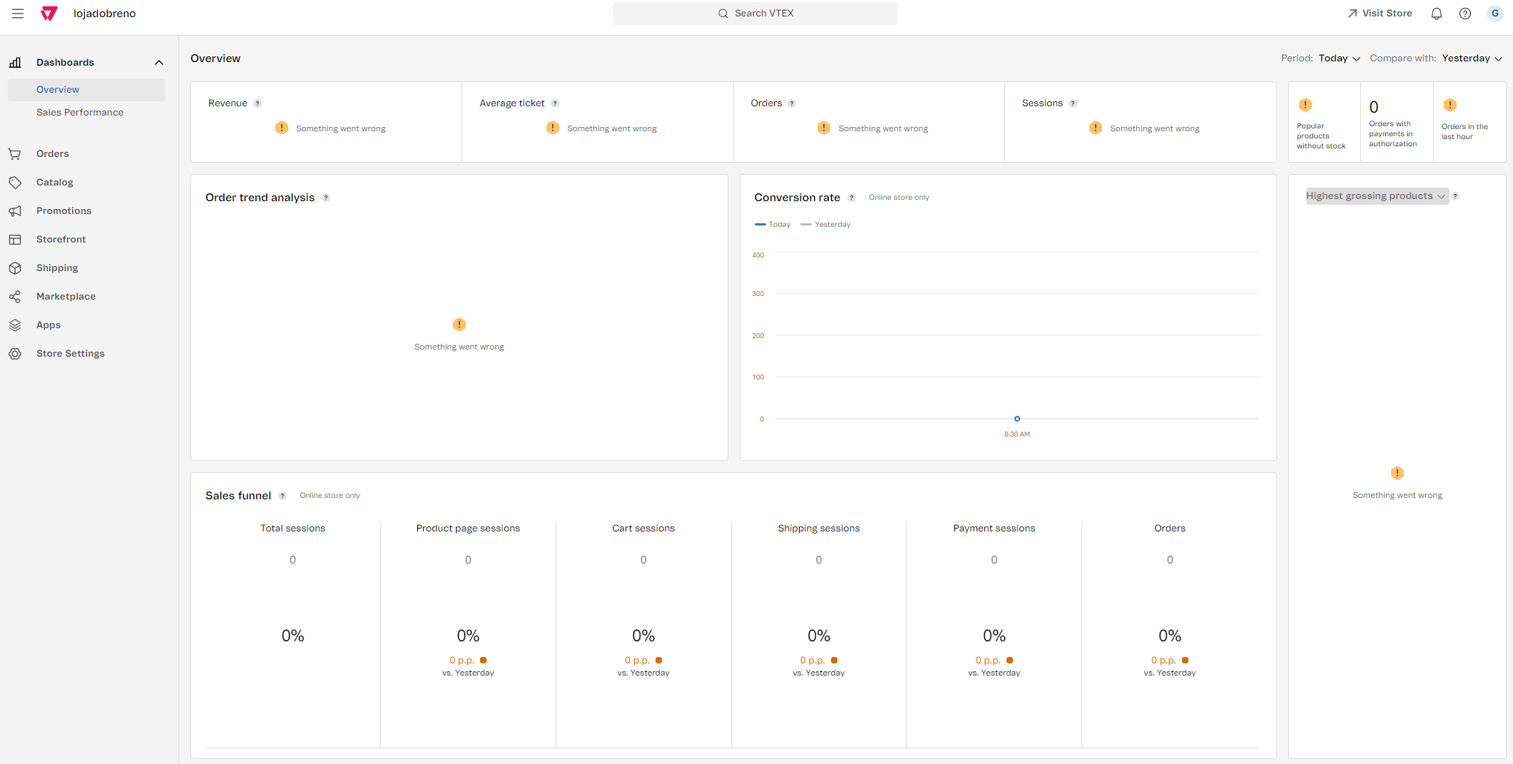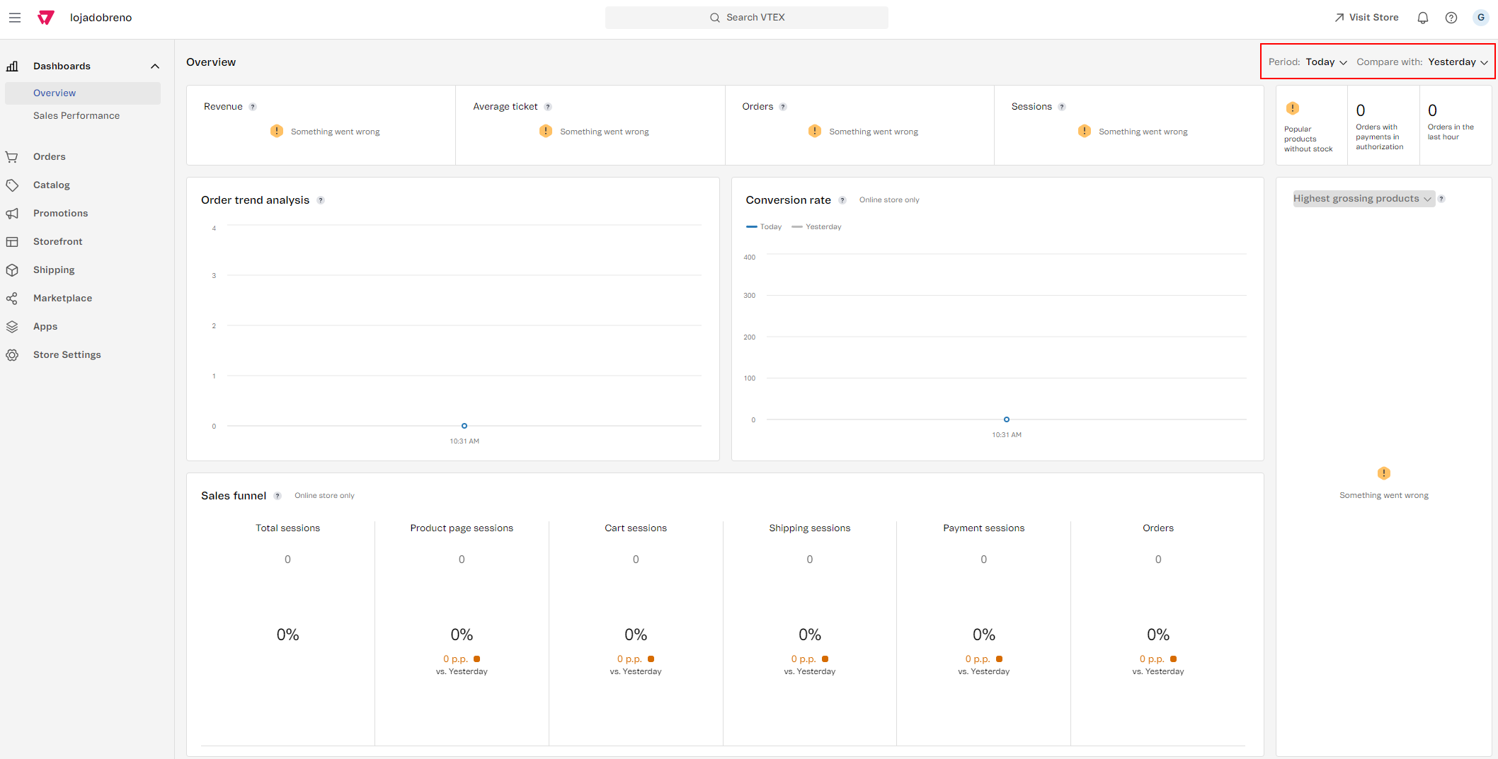Adjusting the comparison period can solve the issue by displaying relevant metrics. To ensure the selected period in the Overview dashboard contains valid order data, follow these steps: