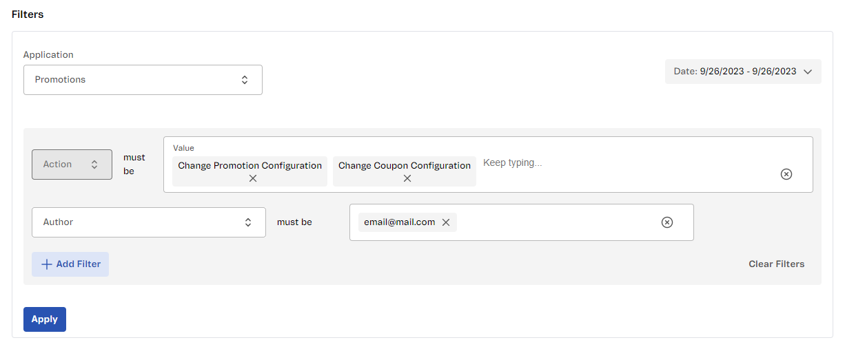 Action = Change Promotion ConfigurationorChange Coupon Configuration), the results include events that match any of the values entered. When adding filters with different parameters (for example:Action = Change Coupon ConfigurationandAuthor = email@mail.com), the criteria are combined. Note that you can repeat steps 4 and 5 to add more filters.For example, the query in the image below returns results for