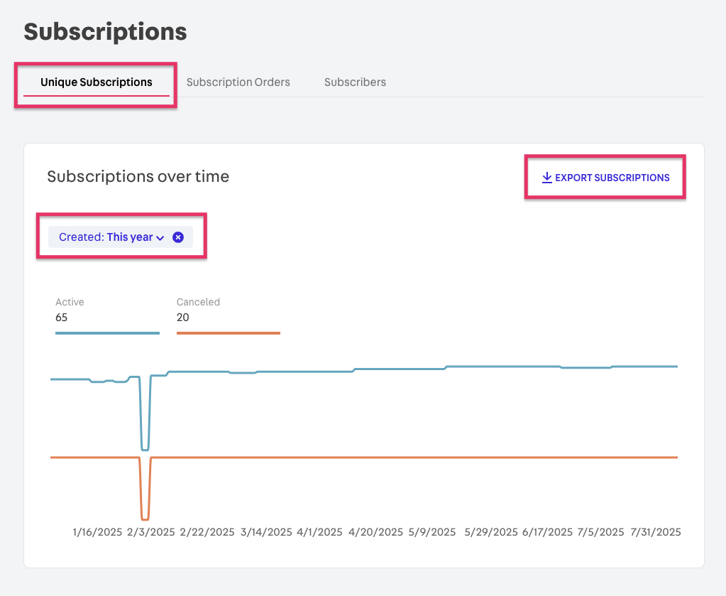 - Export subscriptions within the filtered period by clicking on the button in the upper right corner of the screen.