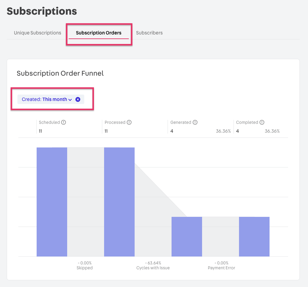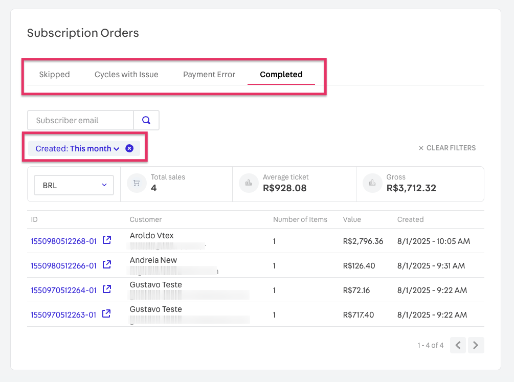 - When accessing each tab of the Subscription Orders table, you can view the flow and details of the orders that were skipped, those that presented Cycles with an issue, those that contain a Payment Error and the Completed orders.