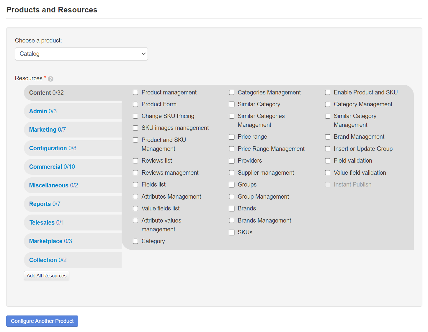 6. If you want to add resources from another product, click the Configure Another Product button at the bottom of the product and resource list and repeat steps 4 and 5.