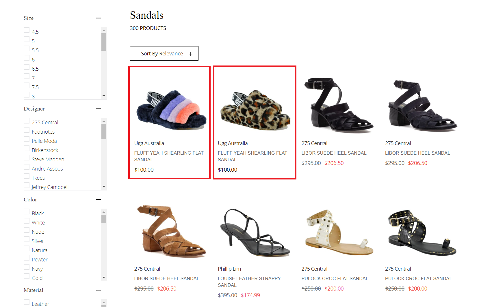 See the following example of detaching SKUs by color. In the image below, the featured sandals are available in two different colors in the search results: