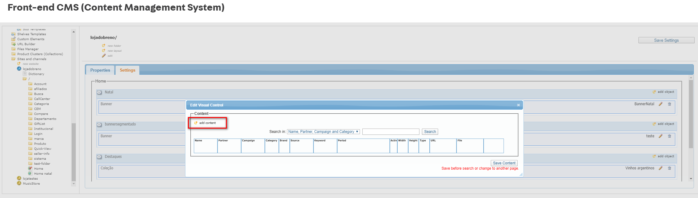 - Open the layout and then click on the Settings tab. The new placeholder should appear there, with the name equal to the id value defined in the control. For now, this placeholder is empty, meaning there are no objects inside it.