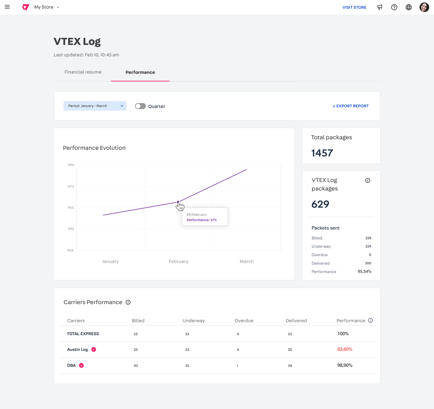 You can monitor the performance of the carriers configured in your store's logistics through an analytical tool. On the VTEX Shipping Network dashboard, you can see VTEX Shipping Network carriers' overall performance and detailed information on each one.