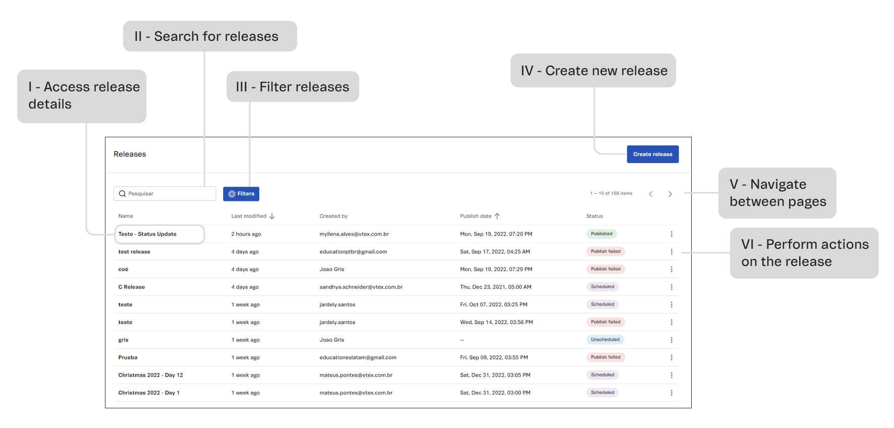 Go to the Releases navigation menu to access the Releases page in the VTEX Admin. In the following image, you'll see the interface and what you can do in it: