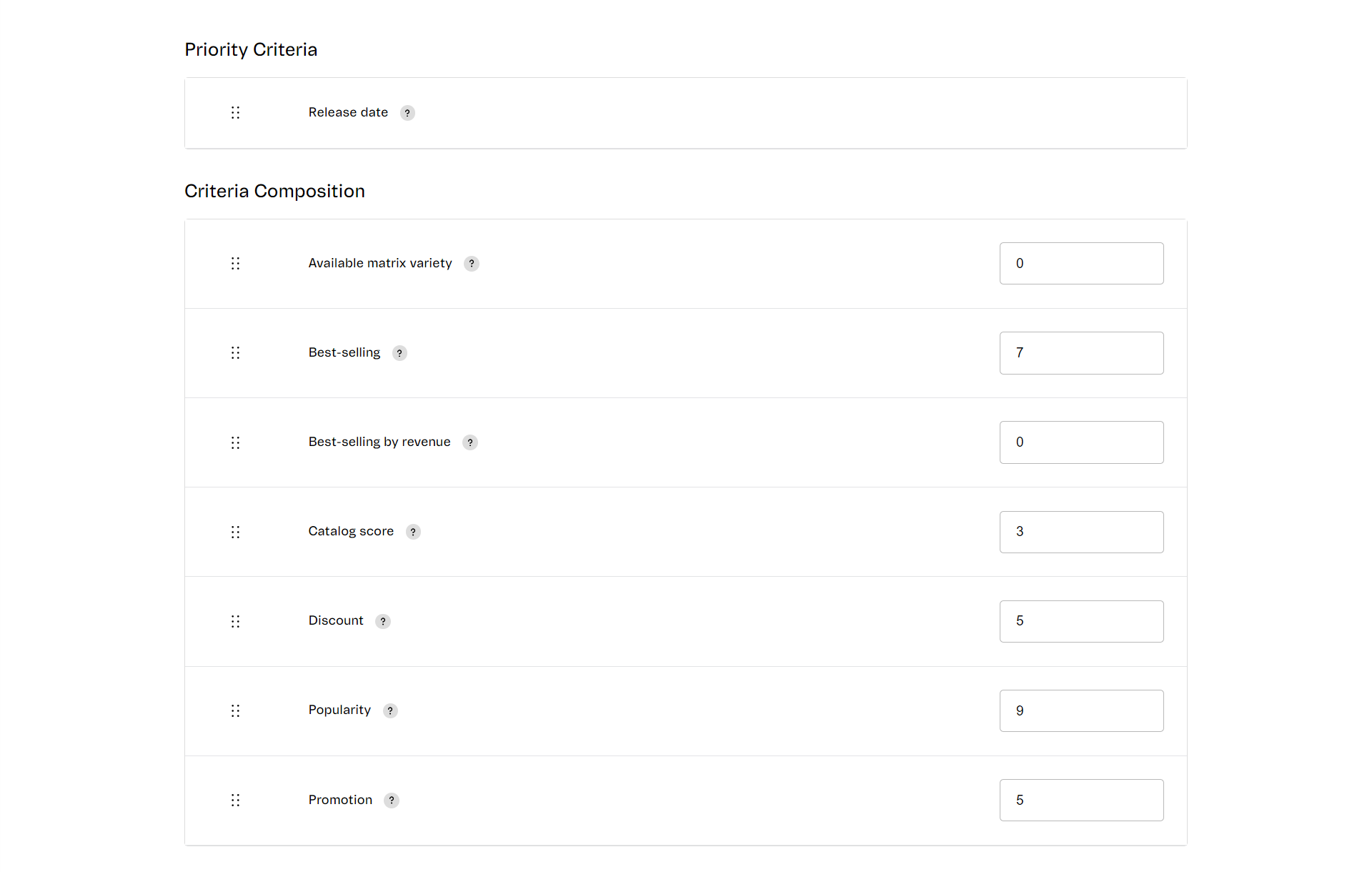 • Catalog score: Catalog sorting tie-breaker based on the value given to the Score field of products. For this purpose of composing relevance, the higher the score, the greater the weight, i.e. the behavior is descending: products with a higher score are prioritized. Find out more about the field and its behavior in the guide How does the Score field work?.