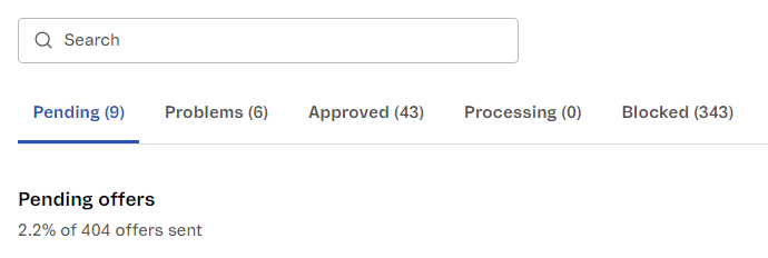 This action can be applied in the offer tabs Pending and Issues. Blocked offers can be viewed in the Blocked tab.