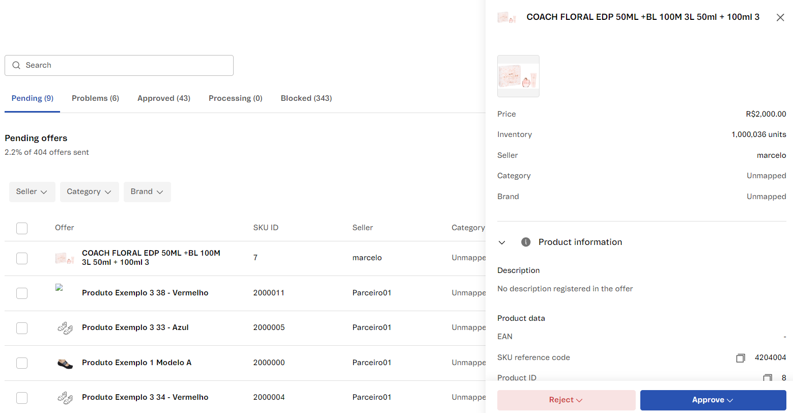 In the Pending tab, you can see a list of all offers sent by a seller that haven't been approved yet. Offers can be filtered by Seller, Category, Brand, and Inventory. Offer actions in this tab include: Create new product, Link to product or SKU, Reject for correction, or Reject and block.