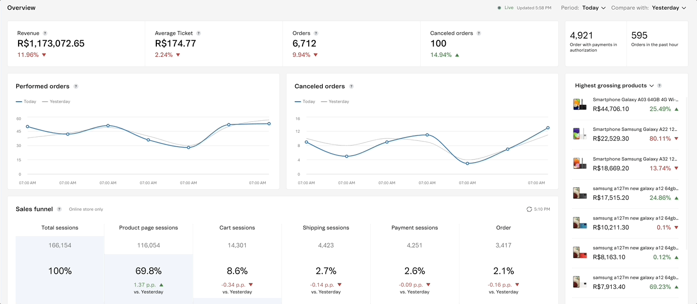 The page's data is updated every hour, so users can expect a delay of 10 to 80 minutes, depending on the time they accessed the page. Users can also filter data by period, and also compare their store’s current metrics with previous ones. The Updated label shows the last time the data was updated.
